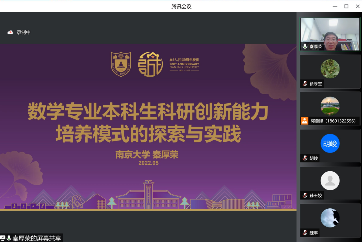 2022年5月6日,应新葡的京集团8814登录入口基础学科拔尖学生培养计划2.0基地负责人胡峻教授邀请,南京大学数学系系主任秦厚荣教授做了题为“数学专业本科生科研创新能力培养模式的探索与实践”的线上报告。新葡的京集团8814登录入口院长田玉斌、副院长徐厚宝及教师代表参加了会议。