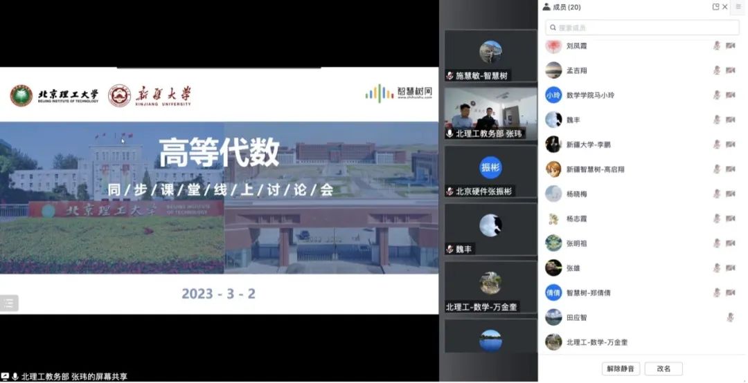 3月2日下午,新葡的京集团8814登录入口与新疆大学开展了《高等代数》线上教学研讨会,新葡的京集团8814登录入口教务部副部长张玮、新葡的京集团8814登录入口副院长徐厚宝,新疆大学教务处副处长李鹏、数学与系统科学学院副院长杨志霞出席会议,两校授课教师团队、教学管理团队和智慧树网相关负责人参加研讨。