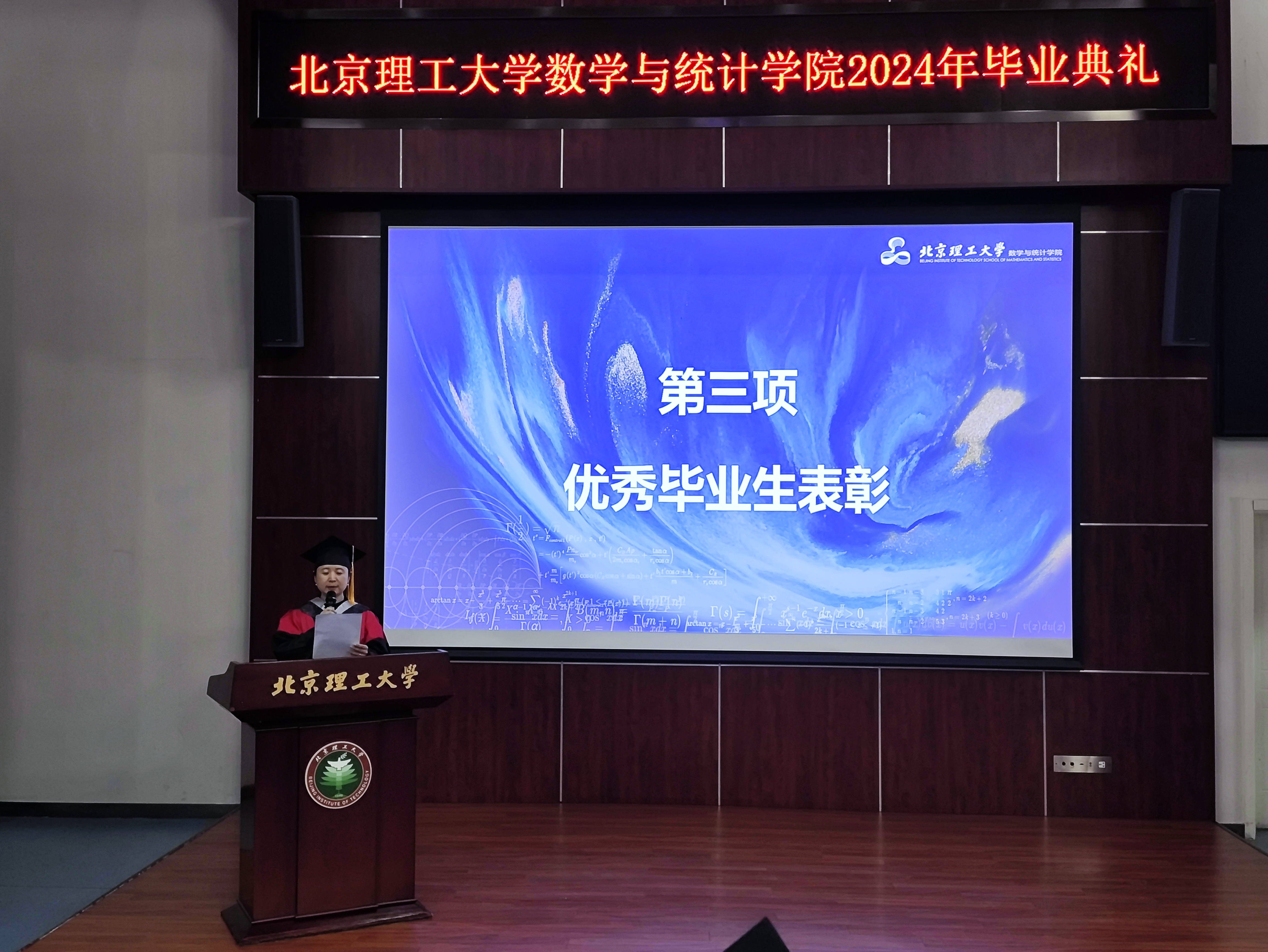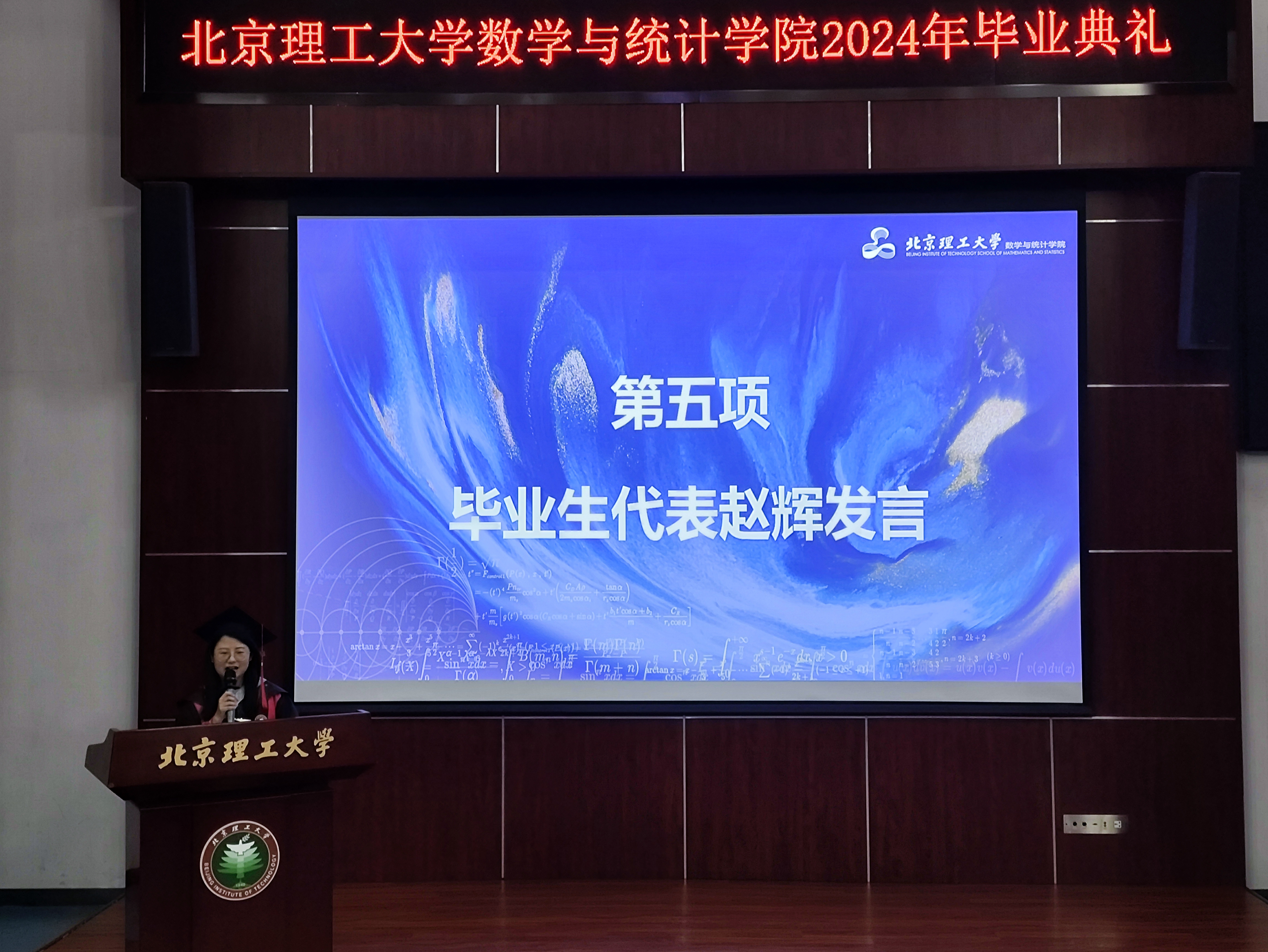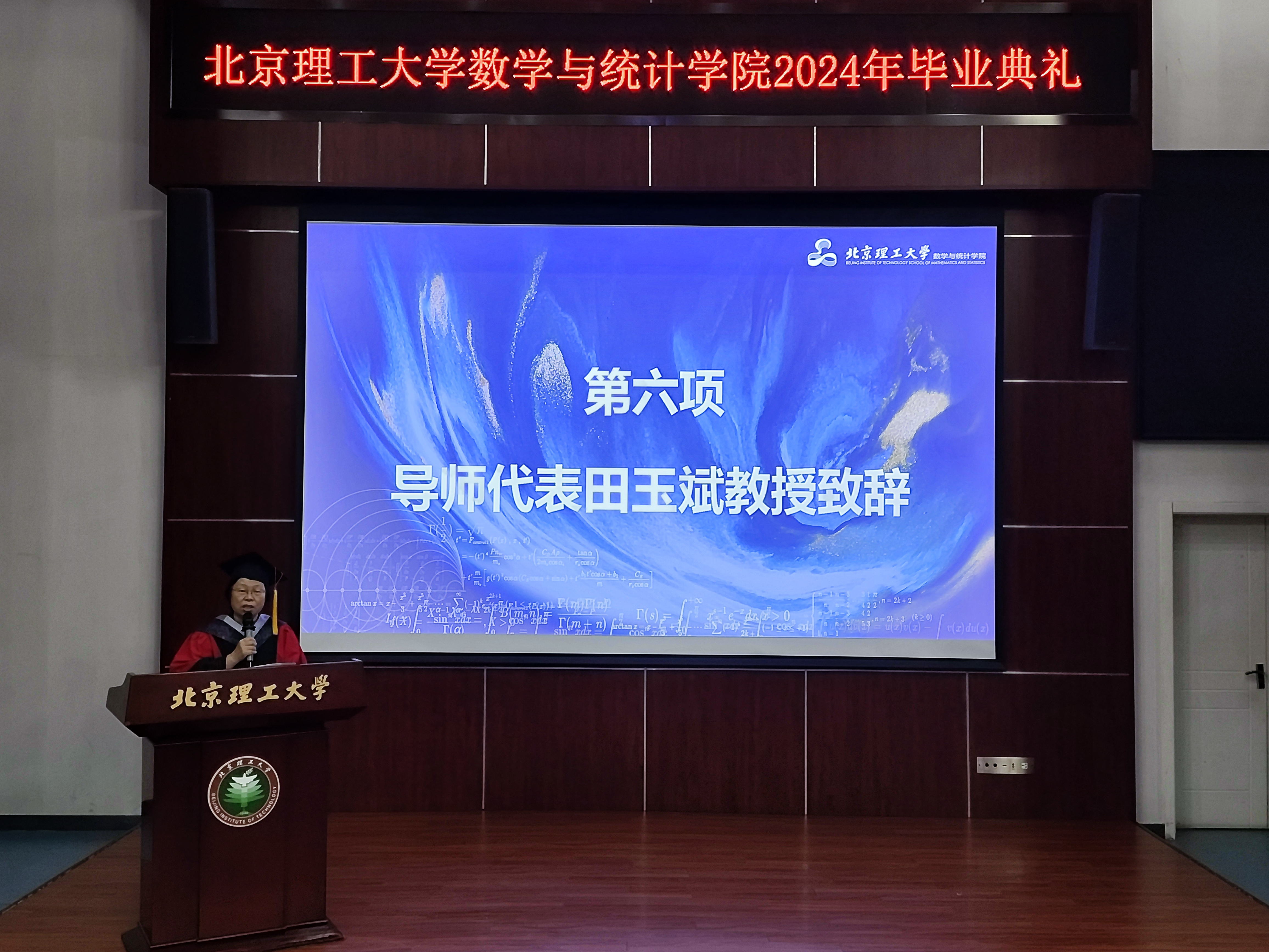 田玉斌教授作为导师代表发言,她向即将踏入新人生阶段的毕业生致以最诚挚的祝贺,寄语同学们发扬奋斗精神、迎接挑战、珍惜时间、追求卓越,不负使命,用扎实的数学功底和创新思维去打开新世界,体现北理工数学人的担当。