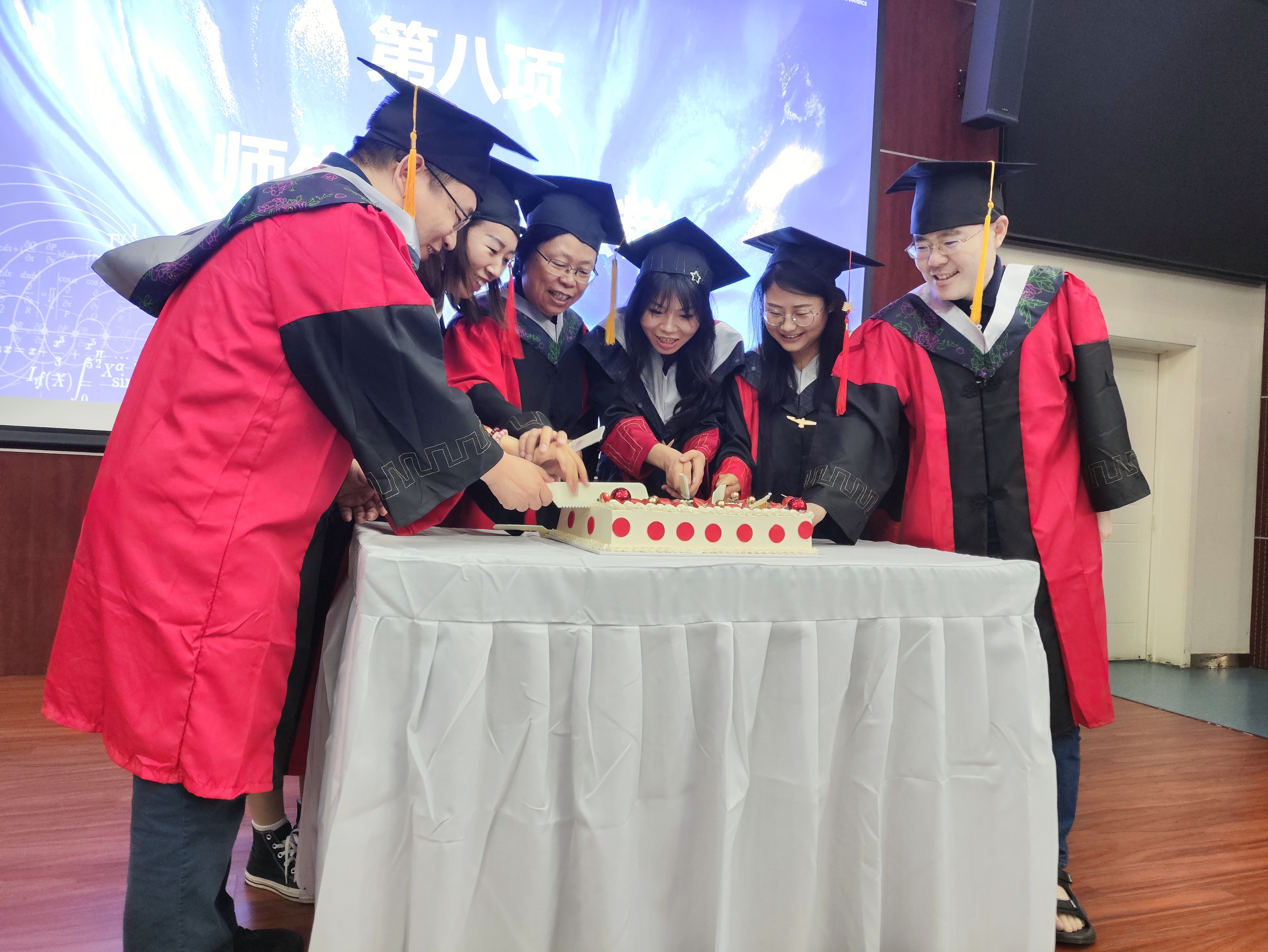 毕业生代表与导师代表互送礼物。全体毕业生共同为老师们准备了毕业蛋糕,导师代表与毕业生代表携手共切毕业蛋糕,许下毕业心愿。